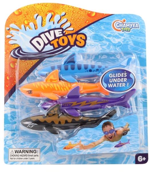 Szórakoztató, 4 cápából álló készlet, amely ideális úszásoktatáshoz vagy medencés és fürdőjátékként.