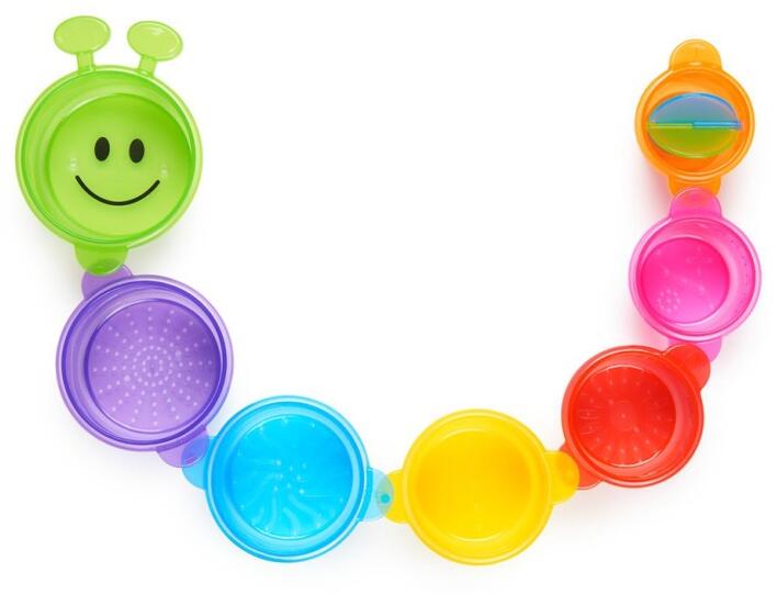 A Munchkin Caterpillar építhető fürdőjáték hosszú ideig képes lekötni a kíváncsi babákat fürdés során, miközben a játék egyes elemeiből egy montessori tornyot építhetnek, az elemeket egymásba illeszthetik, vagy akár bájos hernyóvá építhetik össze.