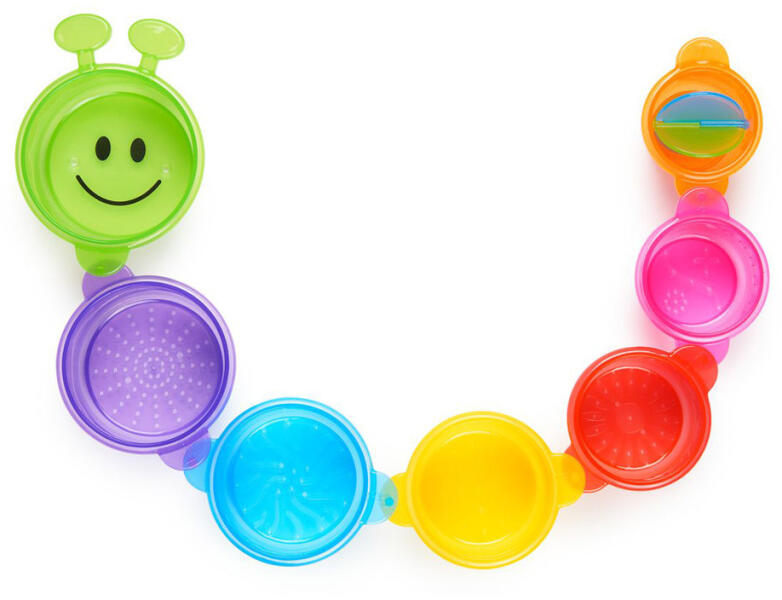 A Munchkin Caterpillar építhetõ fürdõjáték hosszú ideig képes lekötni a kíváncsi babákat fürdés során, miközben a játék egyes elemeibõl egy montessori tornyot építhetnek, az elemeket egymásba illeszthetik, vagy akár bájos hernyóvá építhetik össze. Fõbb jellemzõk: Sokféle játékvariáció: Hét színes pohárka rengeteg játéklehetõséget tartogat az egyszerű vízszűréstõl a komplexebb építõjátékig. Könnyen tárolható: A poharakat egymásba téve kis helyen tárolható. Fejleszti a baba kéz-szem koordinációját:Egymásba rakható, toronnyá építhetõ, hernyóvá összeépíthetõ. Technikai jellemzõk: 7 db színes, műanyag pohárka. A legfelsõ apró propellerrel rendelkezik 9 hónapos kortól ajánlott Tisztítás: Öblítse le tiszta vízzel, és hagyja levegõn megszáradni.