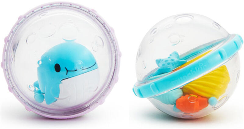 A babád szereti a csörgõ, forgó és csillogó dolgokat? Akkor garantált a szórakozás a Munchkin Float & Play Bath Bubbles játékkal! Minden lebegõ golyó belsejében van egy vicces figura, amely zörög, himbálózik, csillog és forog. A játékokat kis kezekre tervezték, és segítik a kéz-szem koordináció fejlesztését, miközben a gyerekek megtanulják elérni, megragadni és rázni a buborékokat. A különbözõ textúrájú színes gyűrűk szabadon mozognak, és ösztönzik a baba mozgását, miközben felfedezi õket. 4 hónapos kortól ajánlott!